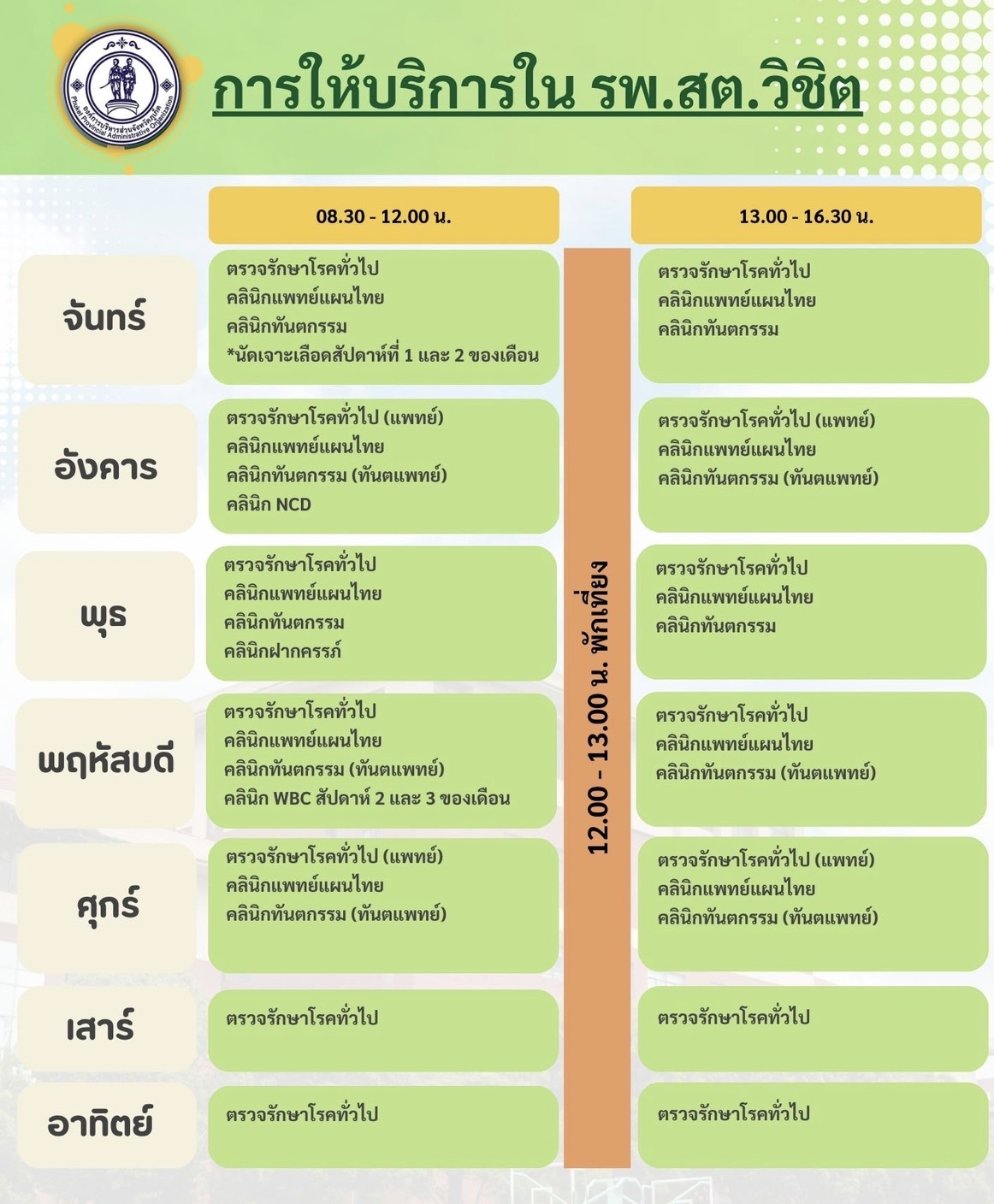 บริการทุกวัน อังคาร และวันศุกร์ เวลา 13.00 น. - 15.00 น. เพื่อความสะดวกกรุณาลงทะเบียนนัดหมาย อสม.ใกล้บ้าน หรือ Walk in เข้ารับบริการโดยโทรนัดล่วงหน้า เบอร์ 076-391405